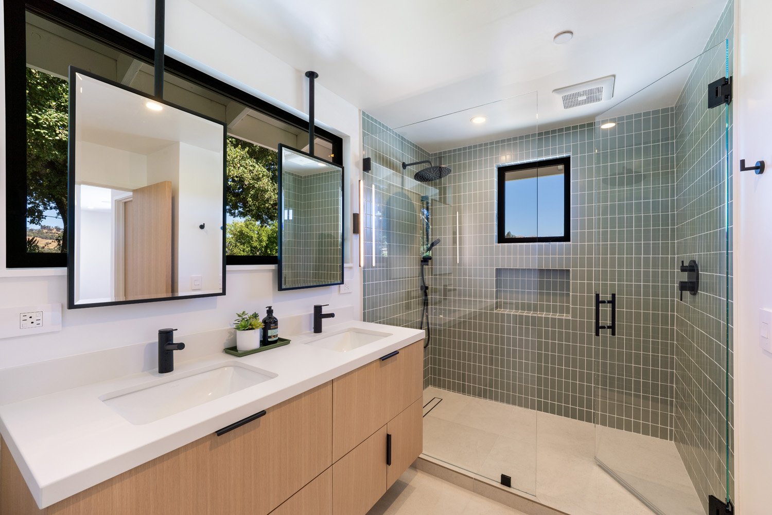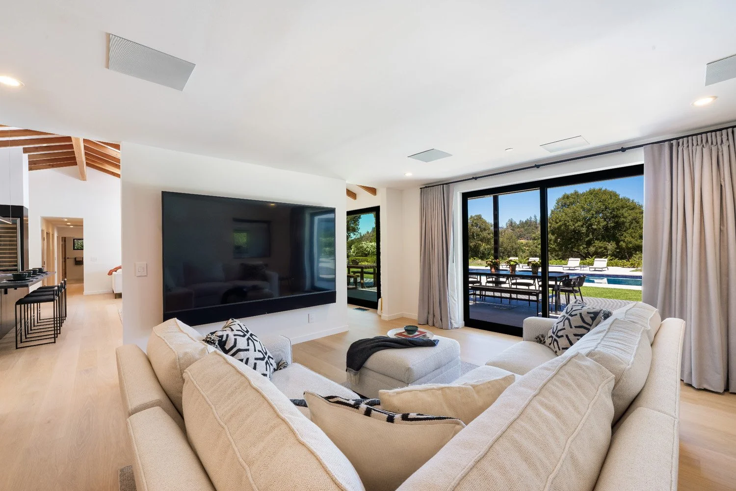 Additional windows were added across the front elevation, and a glass front door opening on to a new front deck of thermal treated wood reinforced the home’s new openness and sense of arrival. The kitchen layout was reconfigured to welcome more daylight: a new long, tall window replaces the traditional wrap-around countertop, creating a visual connection between the kitchen and the front of the house. In the rear, a new multi-panel slider was added to connect the expansive back patio to the refurbished pool deck. Behind the vanity in the primary bathroom a full large window was added behind the mirrors to bring in more light while still allowing some view. Interior finishes and fixtures were upgraded throughout, including multiple custom built-ins and contemporary hardware and lighting. A new surround sound system was added to the media room, and built-in bunkbeds were added in a playful kids’ zone,