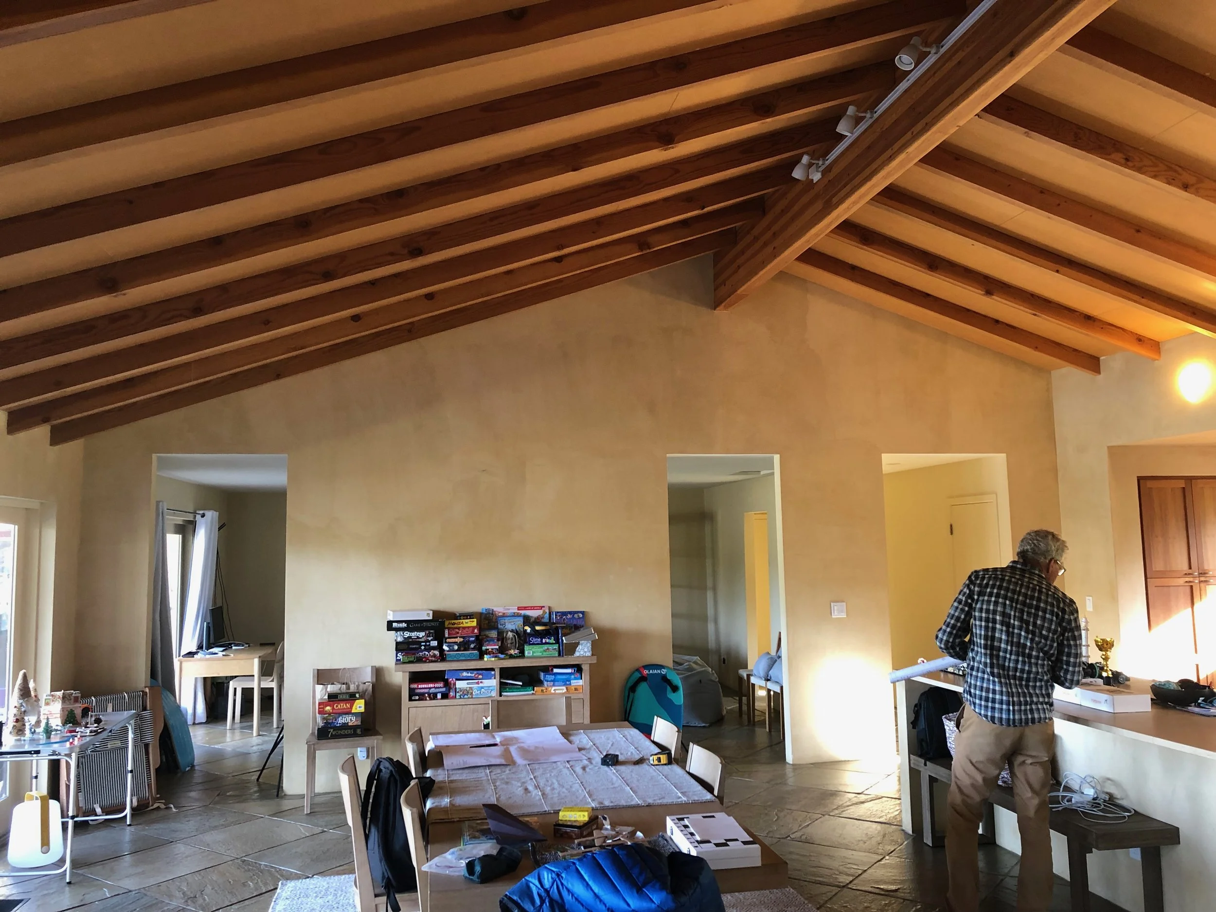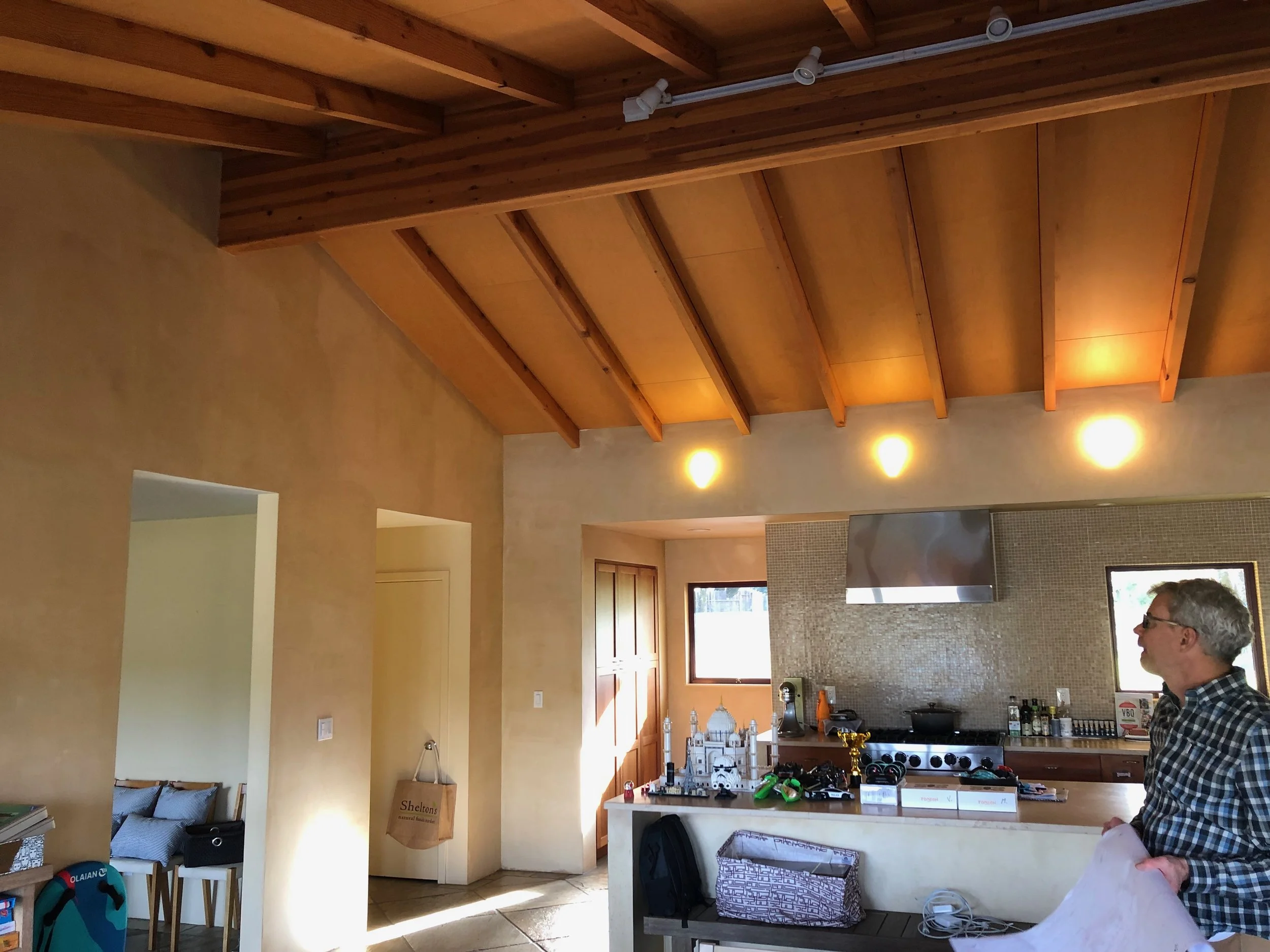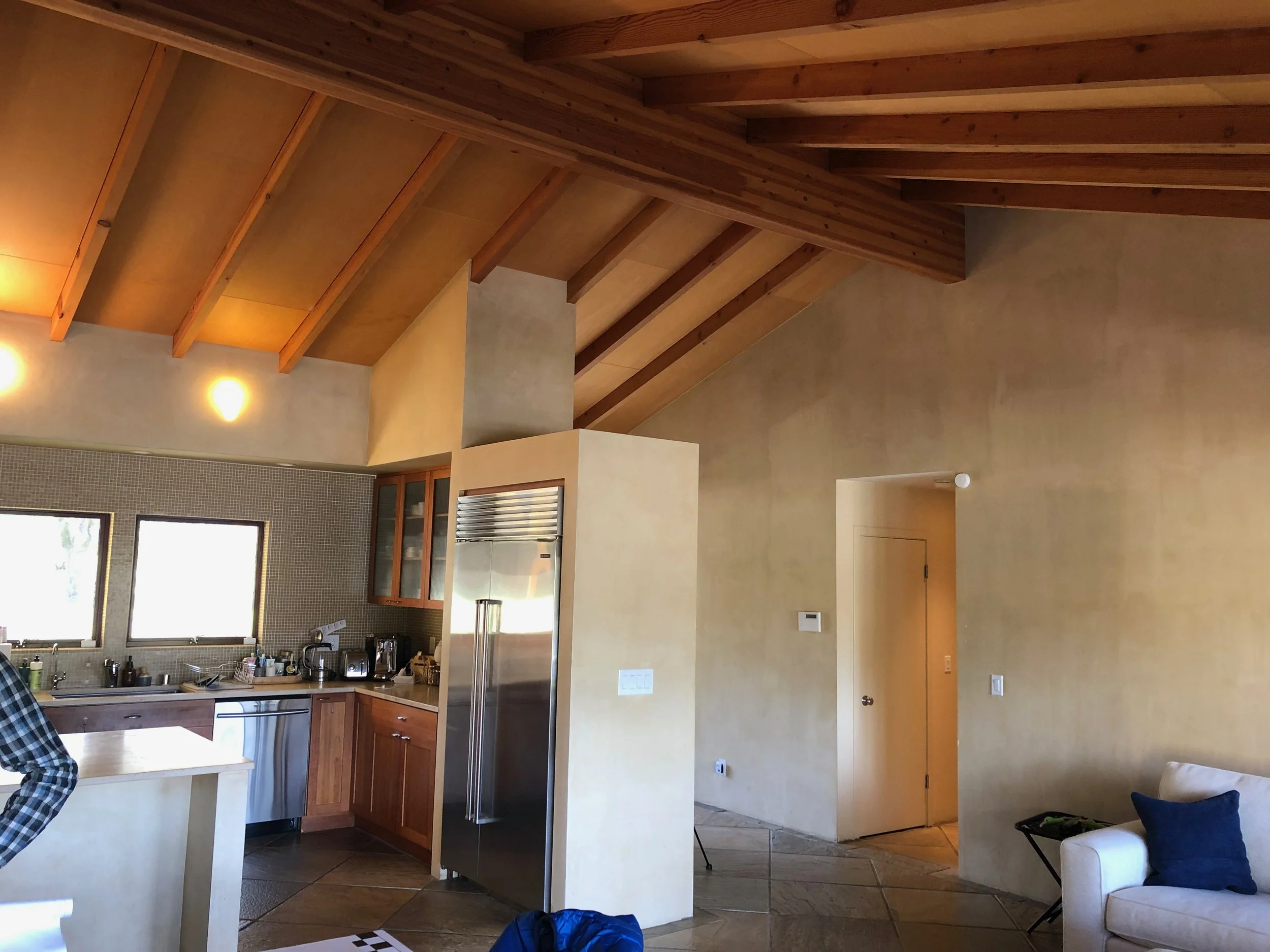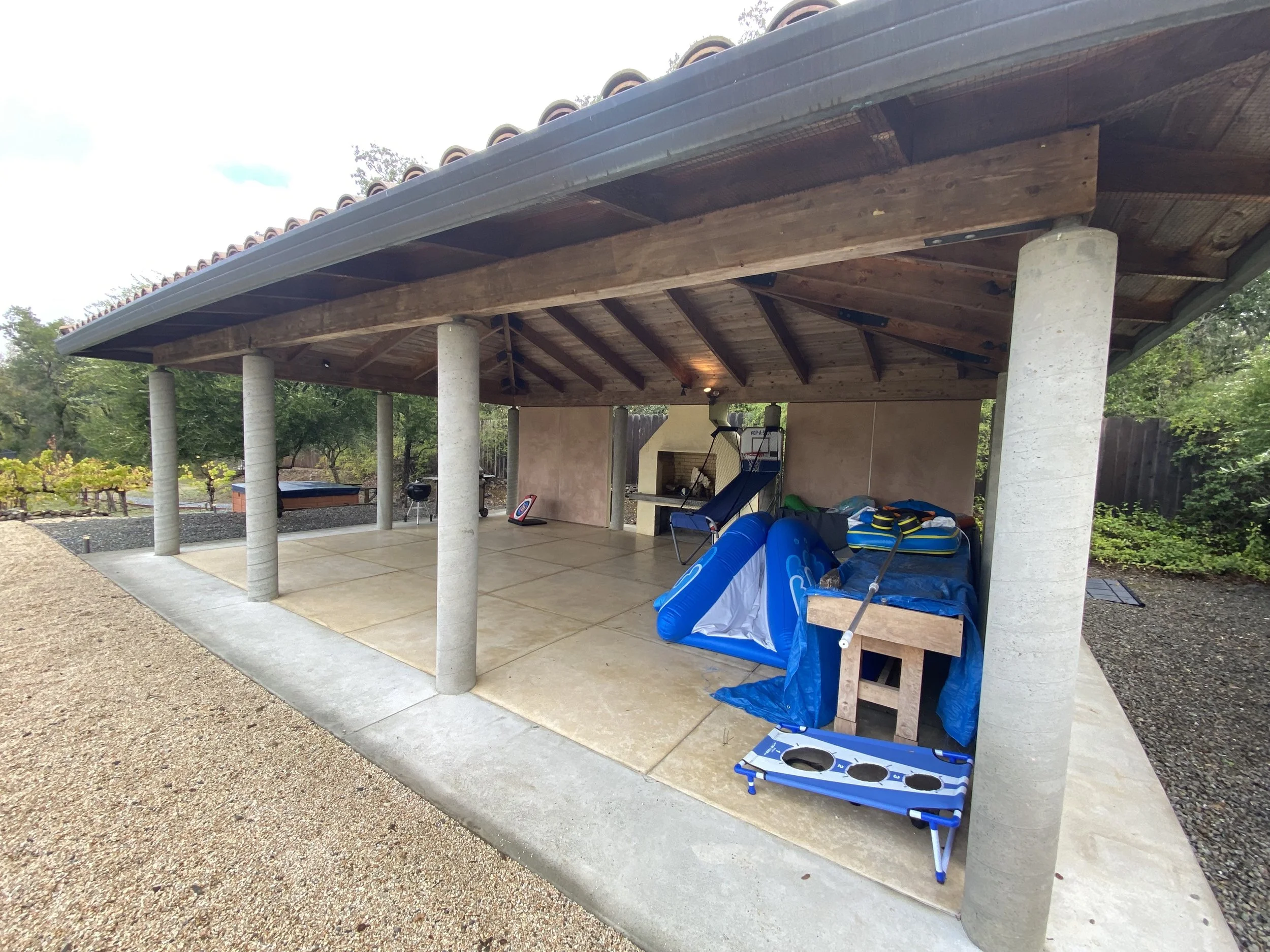 On the exterior, the overhang of the roof was cut back at the rear to open up views, immediately transforming the feel of the formerly dark, boxed-in rooms. A sleek new metal roof was installed, and bulky concrete posts were removed from the back deck and replaced with a mechanized louver system that opens and closes to adjust shading. The pool cabana was transformed from an open shed to a building enclosed on three sides with a new bathroom/changing room volume, pizza oven, and outdoor kitchen, with fully closing automated insect screens, which also provided additional shading. The landscape was completely redone, including poured concrete pavers connecting the buildings with the pool and a new in-ground spa that completed the transformation, bringing new life to the built environment of this extraordinary site.