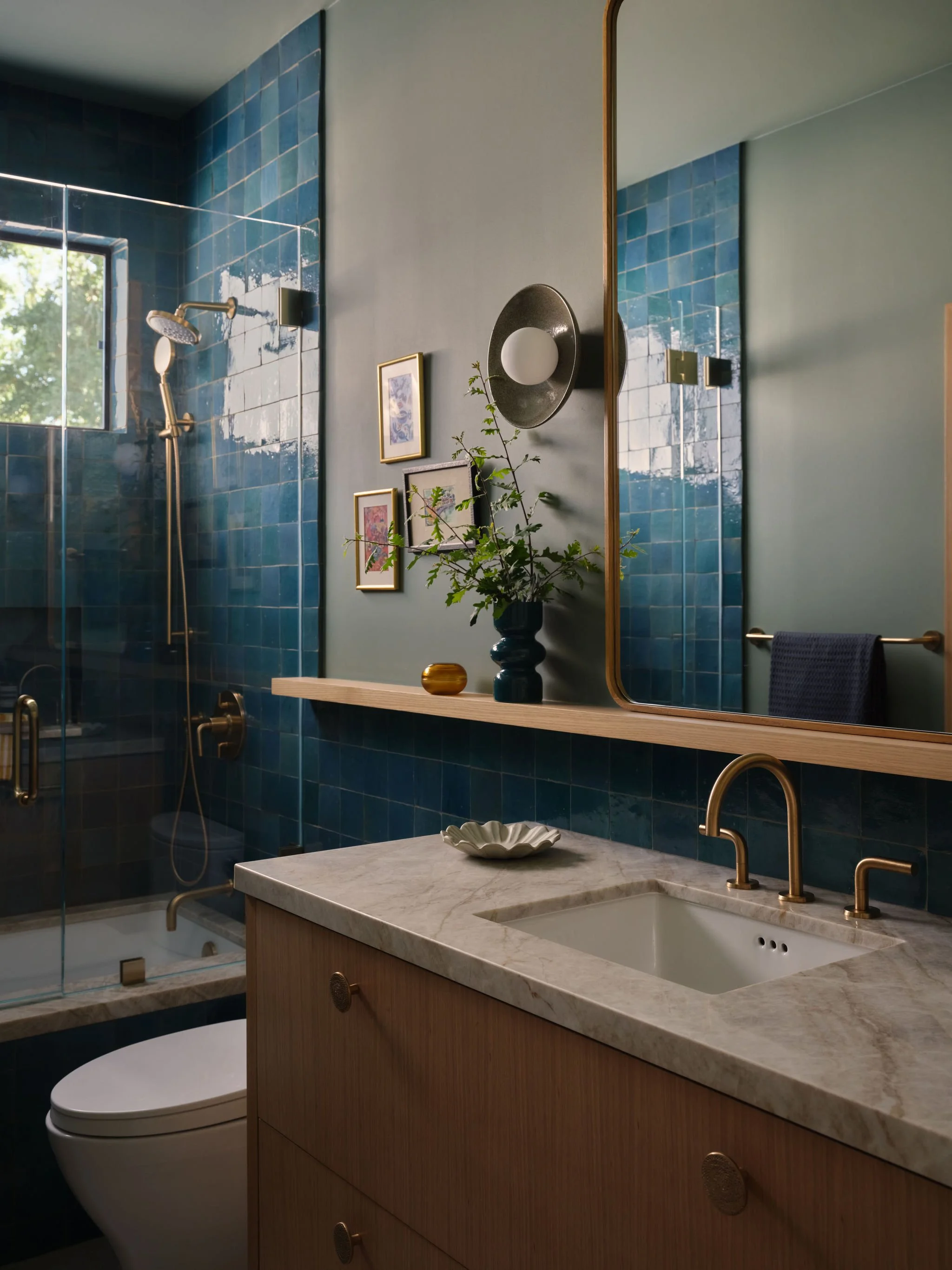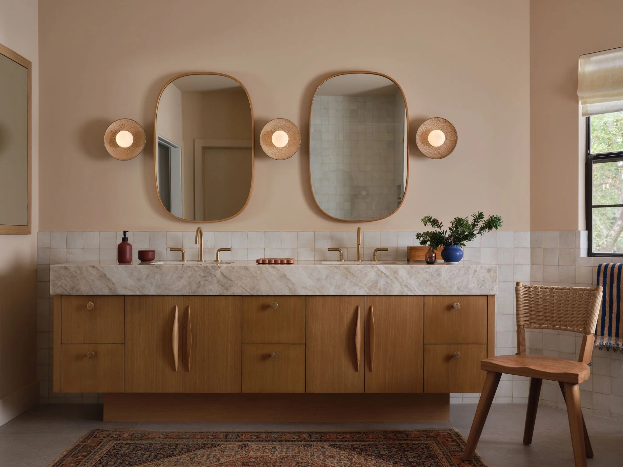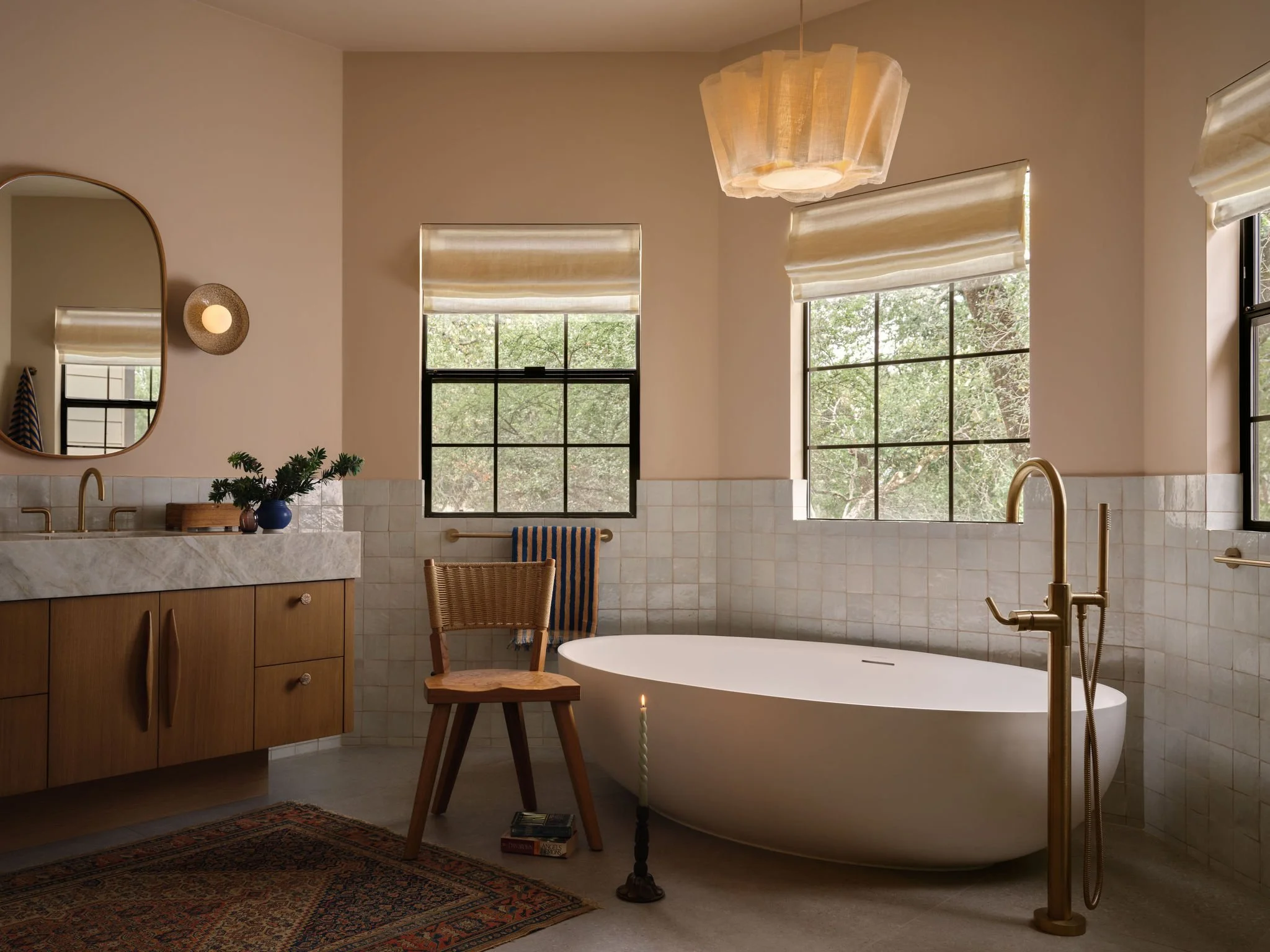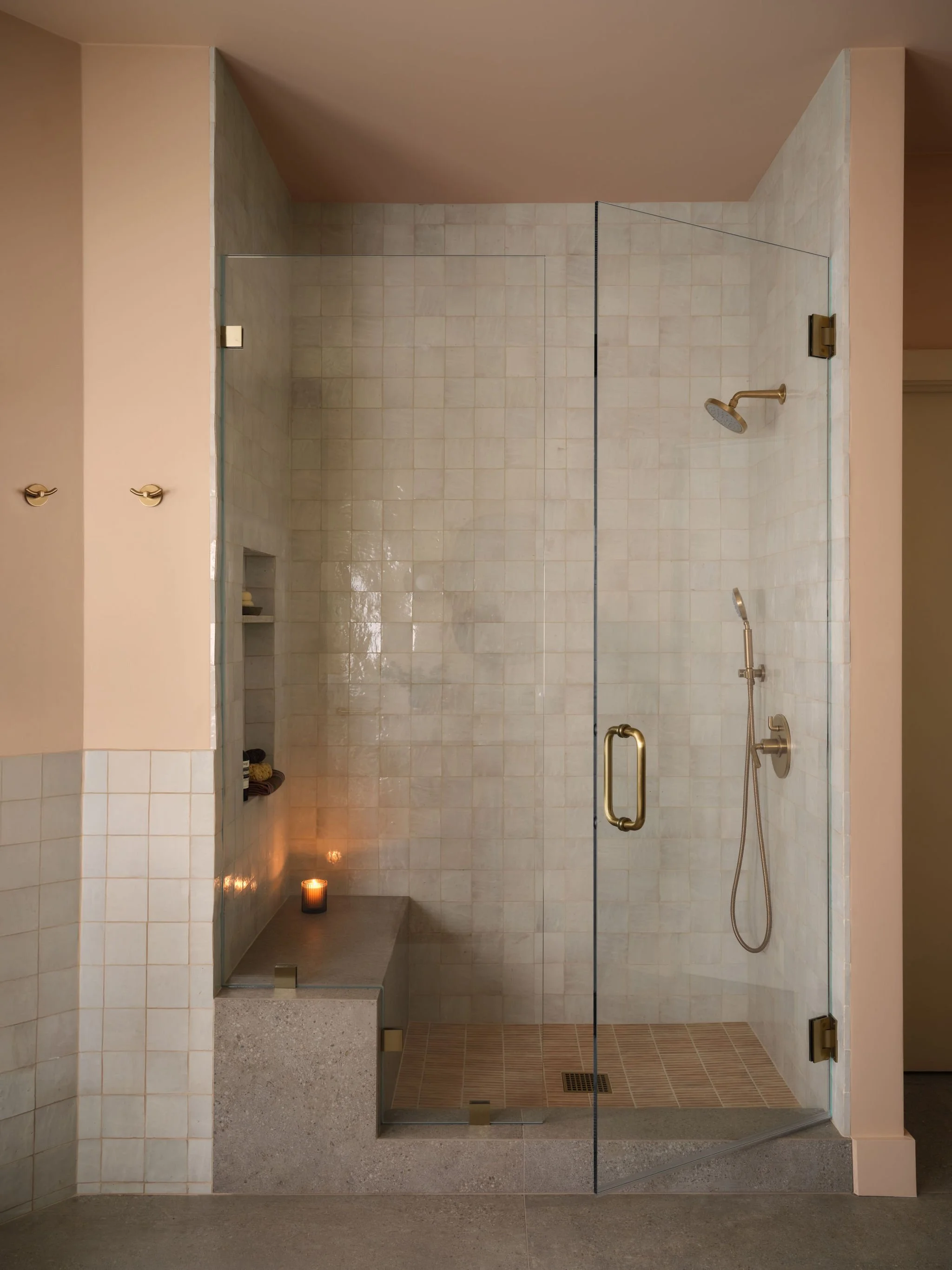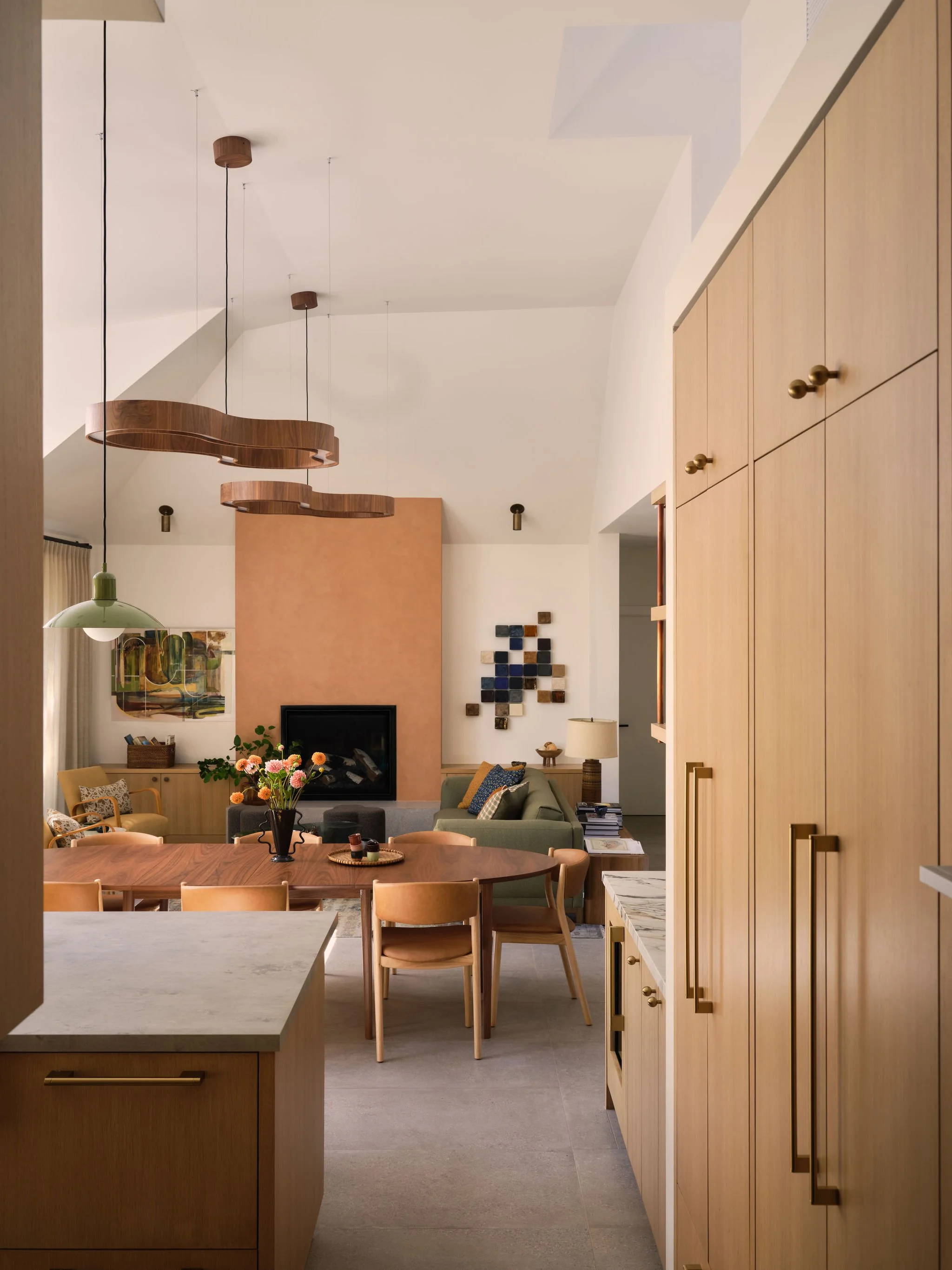 The project evolved into a full remodel focused on simplifying and opening up the primary living areas. We lifted the roofline in the main space, inserted a generous dormer, and added two large skylights to reclaim an unused attic volume, turning it into a spacious, airy great room. The kitchen and living areas, once divided by a level change, were unified and grounded with a large format, concrete-look porcelain tile, and accented with sculptural organic light fixtures. The rest of the house was updated as well, including the primary bath, which was stripped of its oversized tub and angled cabinetry, and rebuilt with modern finishes and fixtures.