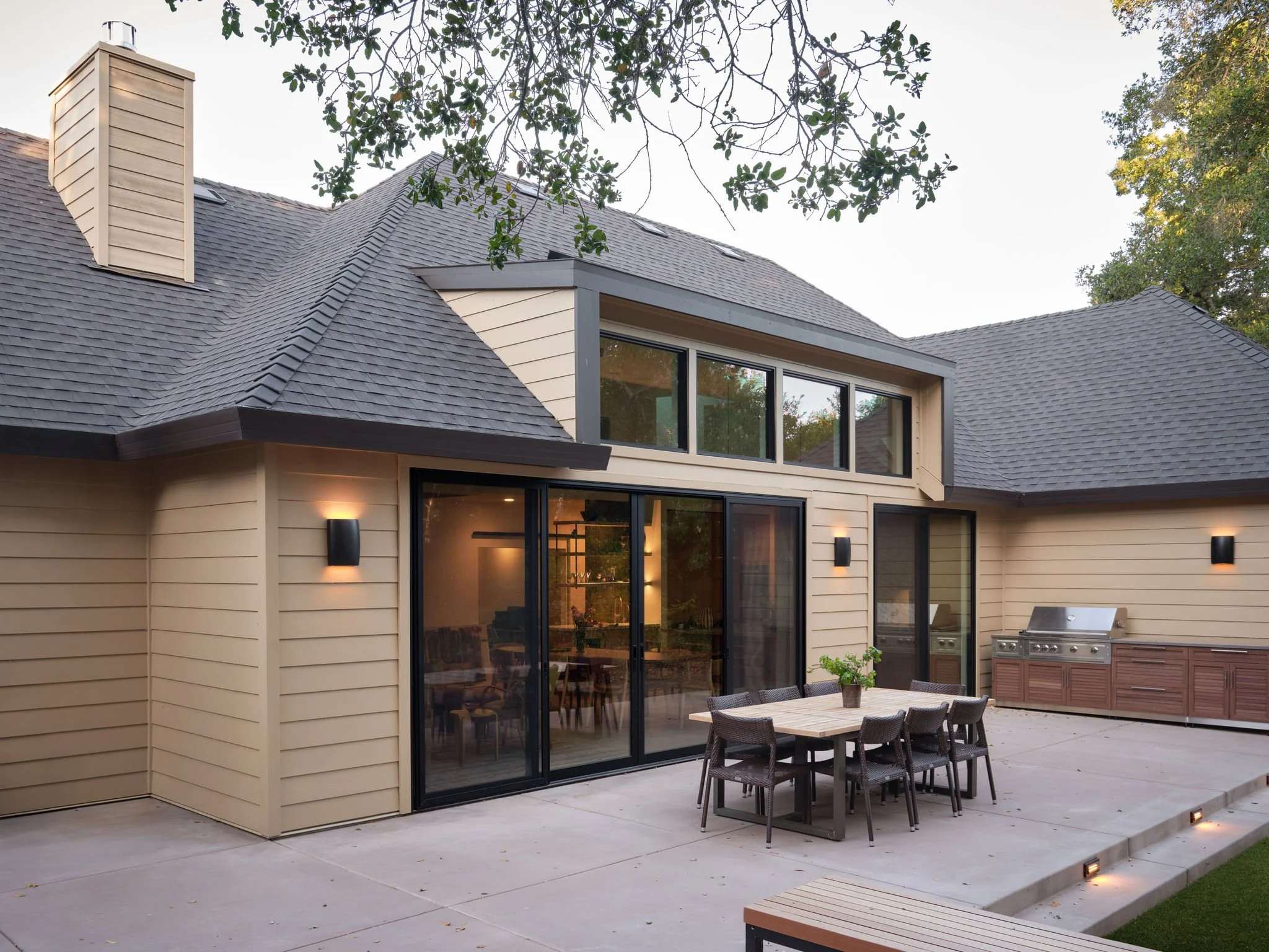 On the exterior, a failing wood deck off the rear of the house was replaced with a durable concrete patio for outdoor dining and lounging. At the front entry, we removed an oversized stone column, replacing it with a more refined structure and a small seating area that adds function and presence to the approach.